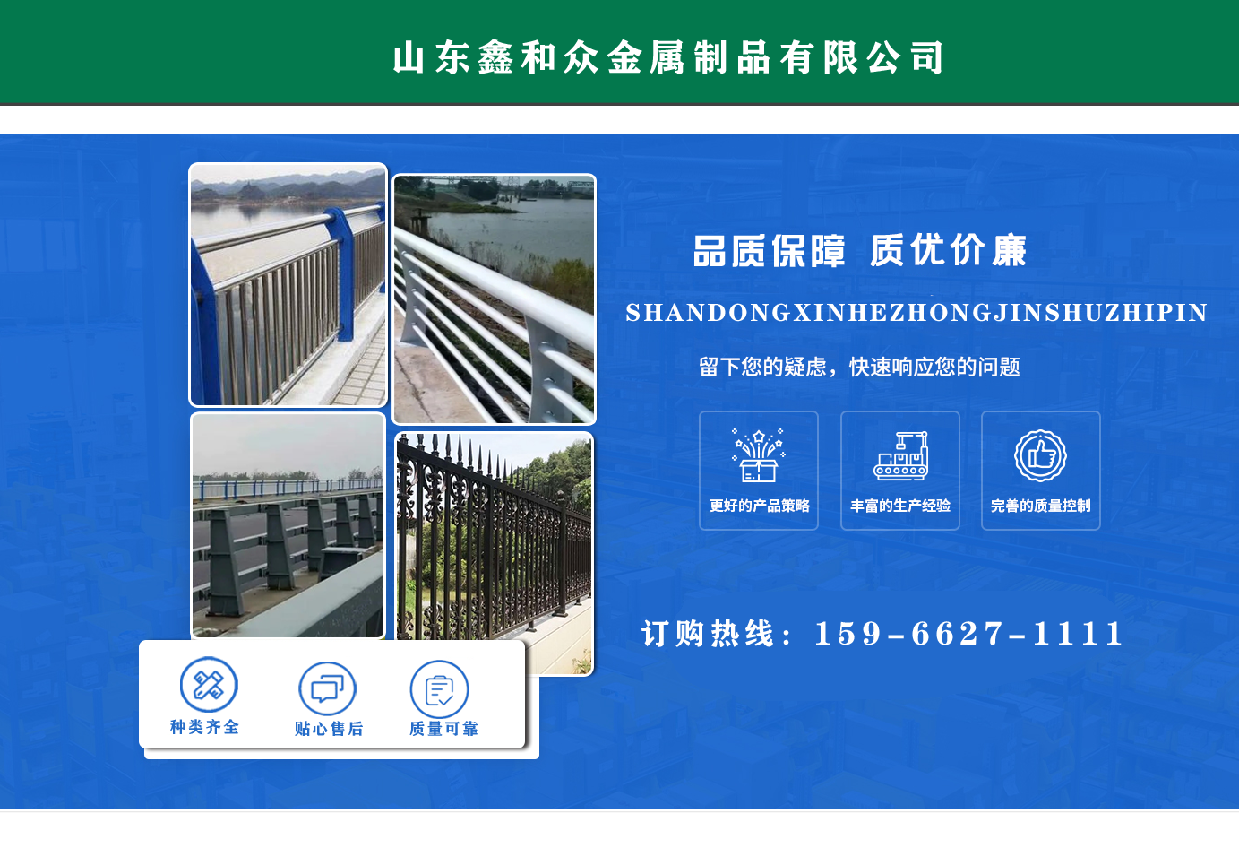 山東鑫和眾金屬制品有限公司主要產(chǎn)品有防撞護欄,橋梁護欄,道路護欄,河道護欄,不銹鋼護欄等護欄。提供設計方案,一站式定制,包您滿意價格優(yōu)惠,歡迎來電咨詢! 公司常年從事銷售護欄防撞護欄,橋梁護欄,道路護欄,河道護欄,不銹鋼護欄,橋梁鋼護欄,河道燈光護欄等。產(chǎn)品廣泛應用于橋梁、河道、旅游景區(qū)、道路、公路、公園、小區(qū)、景觀、道路防撞等領域?! 」井a(chǎn)品均采用優(yōu)質(zhì)不銹鋼材料,符合相關標準。各種型號不銹鋼復合管及護欄,質(zhì)量嚴格把控。產(chǎn)品強度高、耐腐蝕、焊接牢固、抗沖擊、性能好,防撞護欄結構簡單、美觀實用大方。 歡迎前來訂購!...